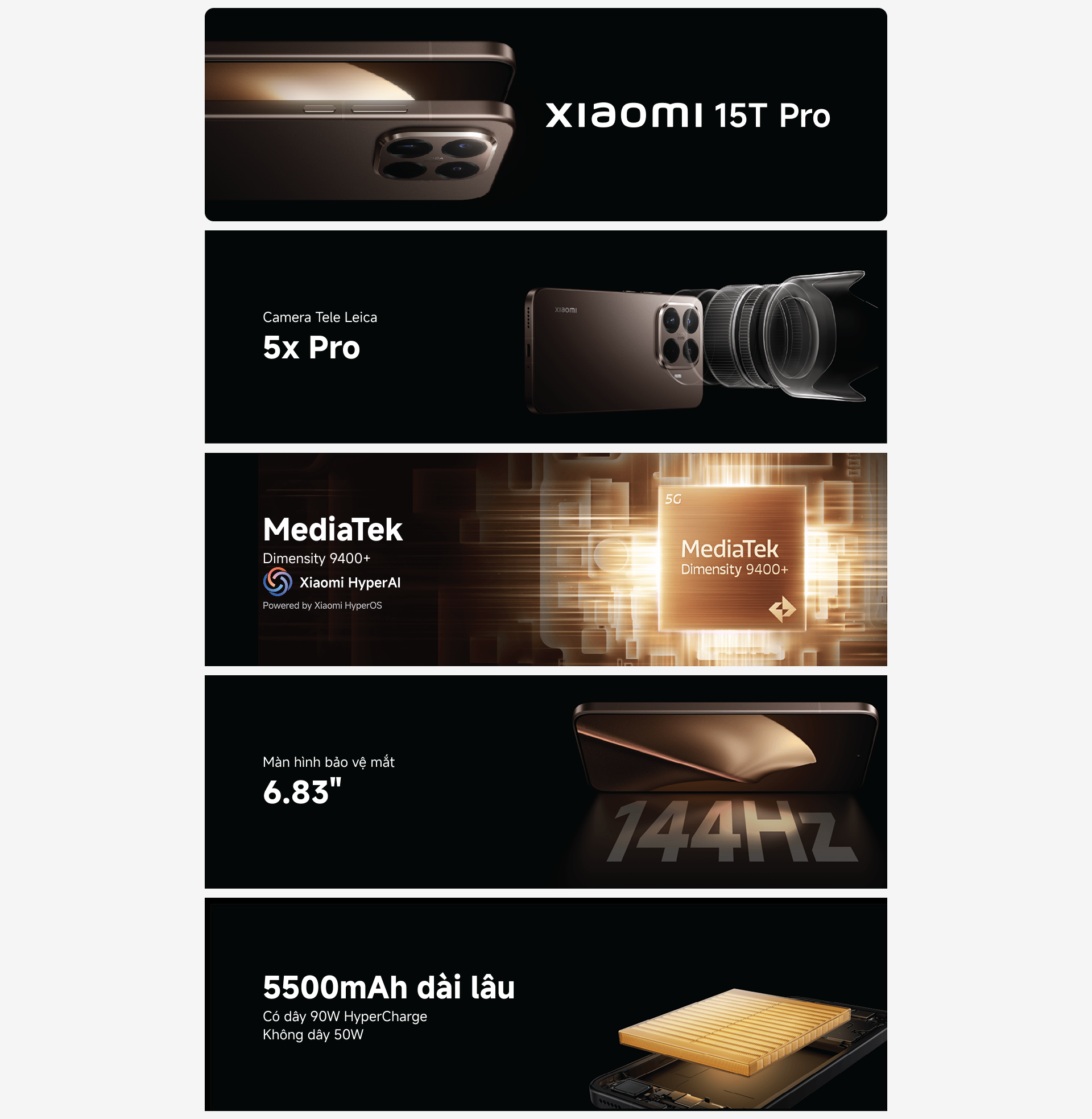 Xiaomi 15T được trang bị chipset MediaTek Dimensity 8400-Ultra, camera Leica 50MP, màn hình 6.83 inch, hỗ trợ tần số quét 120Hz. Viênpin 5500 mAh kết hợp công nghệ sạc 67W, hỗ trợ nạp năng lượng nhanh để tiếp tục sử dụng. Cùng HomeStore tìm hiểu chi tiết nhé.